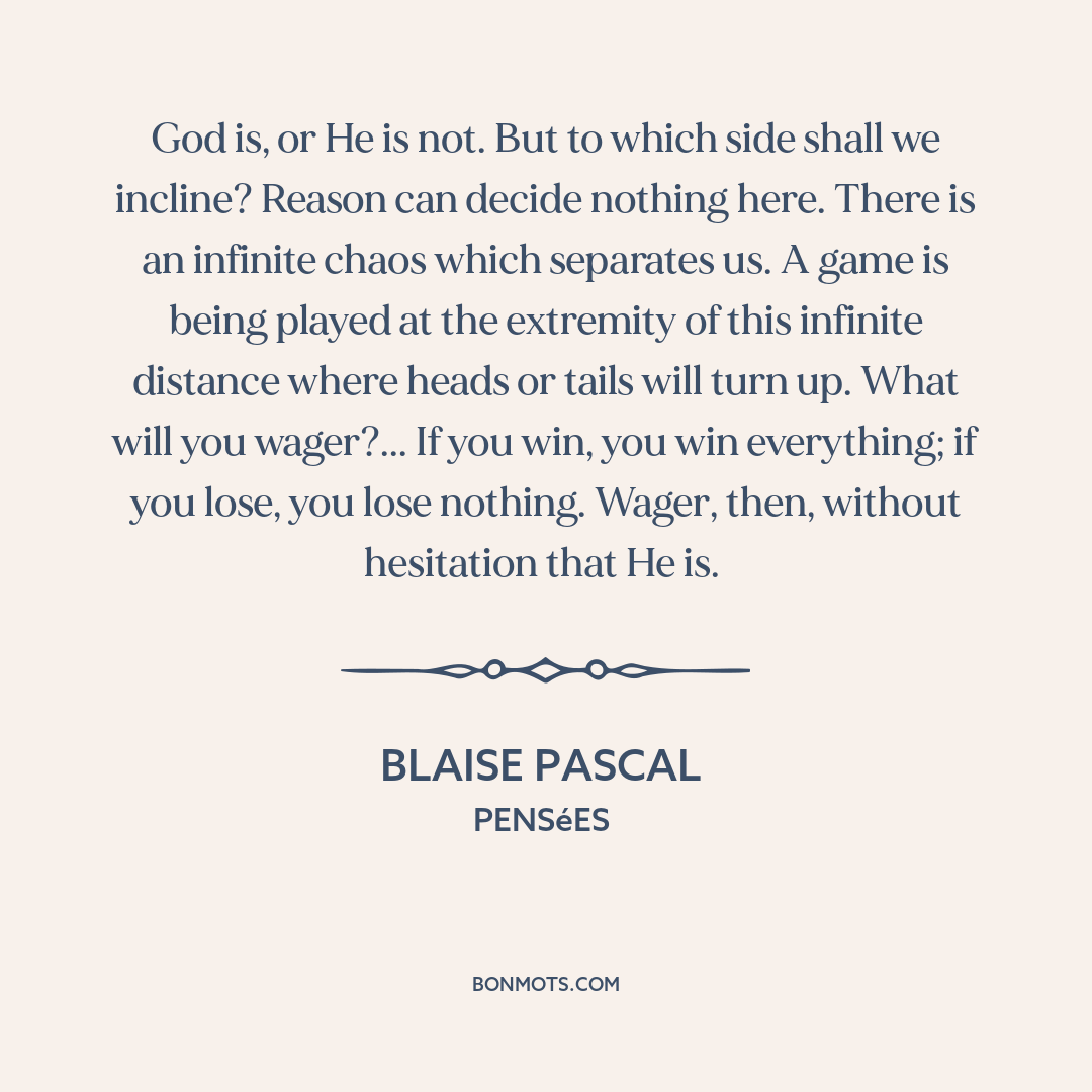 God is, or He is not. But to which side shall we incline? Reason can decide nothing here. There is an infinite chaos which separates us. A game is being played at the extremity of this infinite distance where heads or tails will turn up. What will you wager?... If you win, you win everything; if you lose, you lose nothing. Wager, then, without hesitation that He is.
