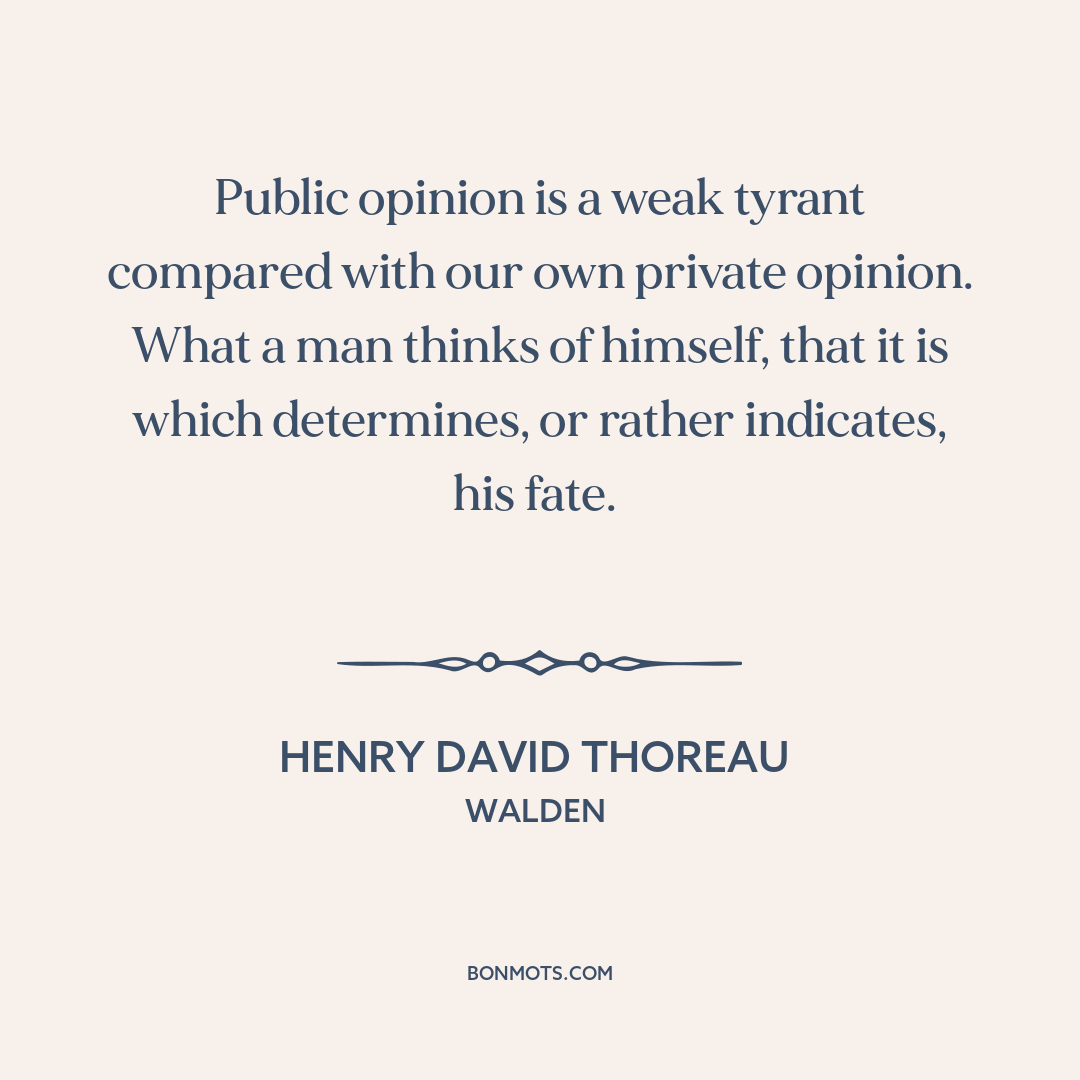 Public opinion is a weak tyrant compared with our own private opinion. What a man thinks of himself, that it is which determines, or rather indicates, his fate.