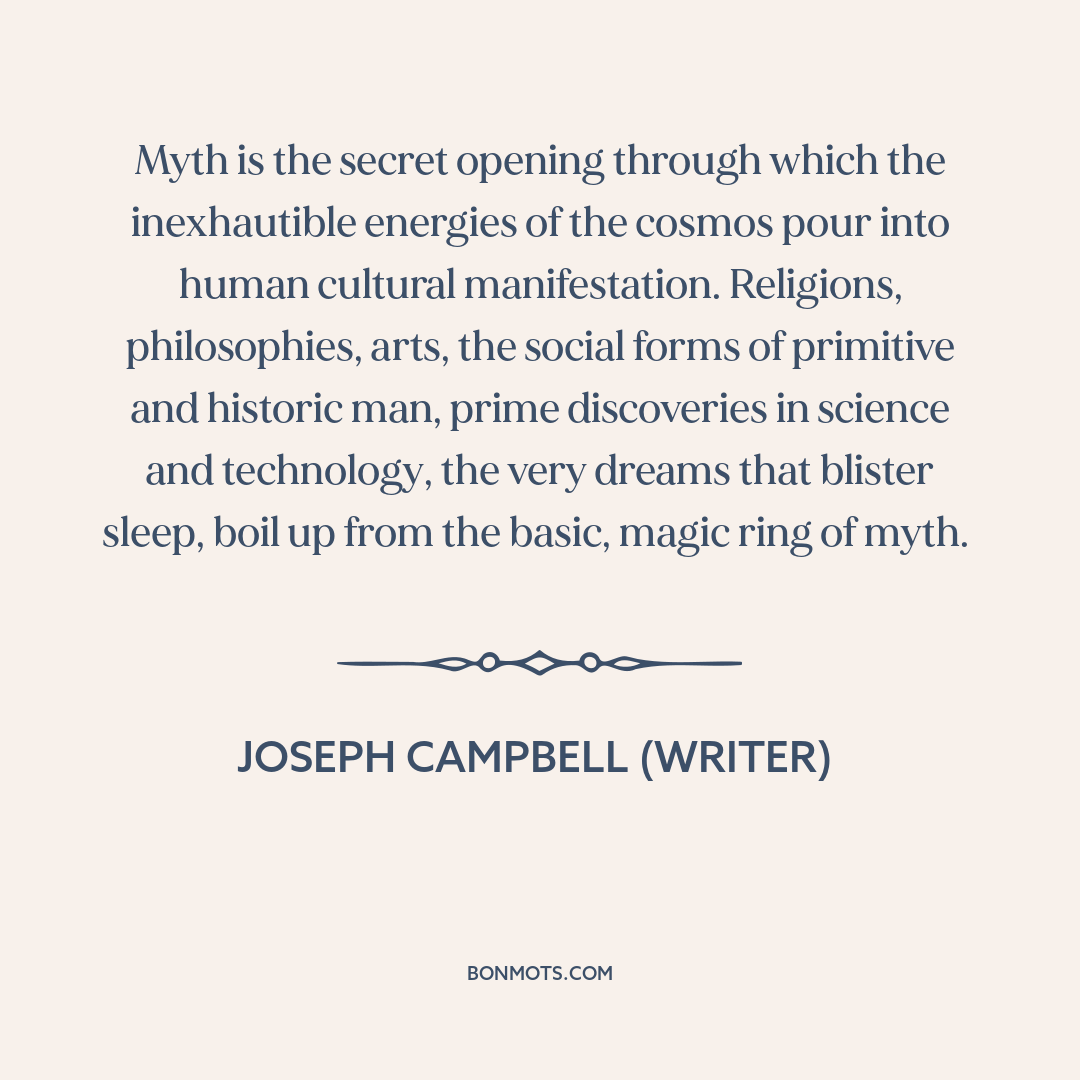 Myth is the secret opening through which the inexhautible energies of the cosmos pour into human cultural manifestation. Religions, philosophies, arts, the social forms of primitive and historic man, prime discoveries in science and technology, the very dreams that blister sleep, boil up from the basic, magic ring of myth.
