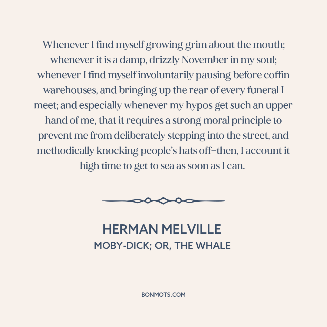 Whenever I find myself growing grim about the mouth; whenever it is a damp, drizzly November in my soul; whenever I find myself involuntarily pausing before coffin warehouses, and bringing up the rear of every funeral I meet; and especially whenever my hypos get such an upper hand of me, that it requires a strong moral principle to prevent me from deliberately stepping into the street, and methodically knocking people’s hats off—then, I account it high time to get to sea as soon as I can.