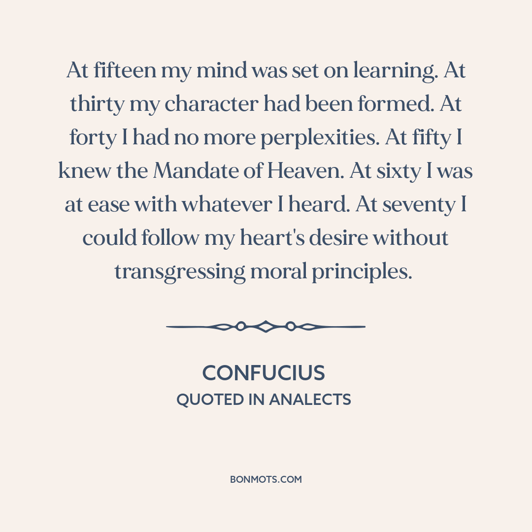 At fifteen my mind was set on learning. At thirty my character had been formed. At forty I had no more perplexities. At fifty I knew the Mandate of Heaven. At sixty I was at ease with whatever I heard. At seventy I could follow my heart's desire without transgressing moral principles.
