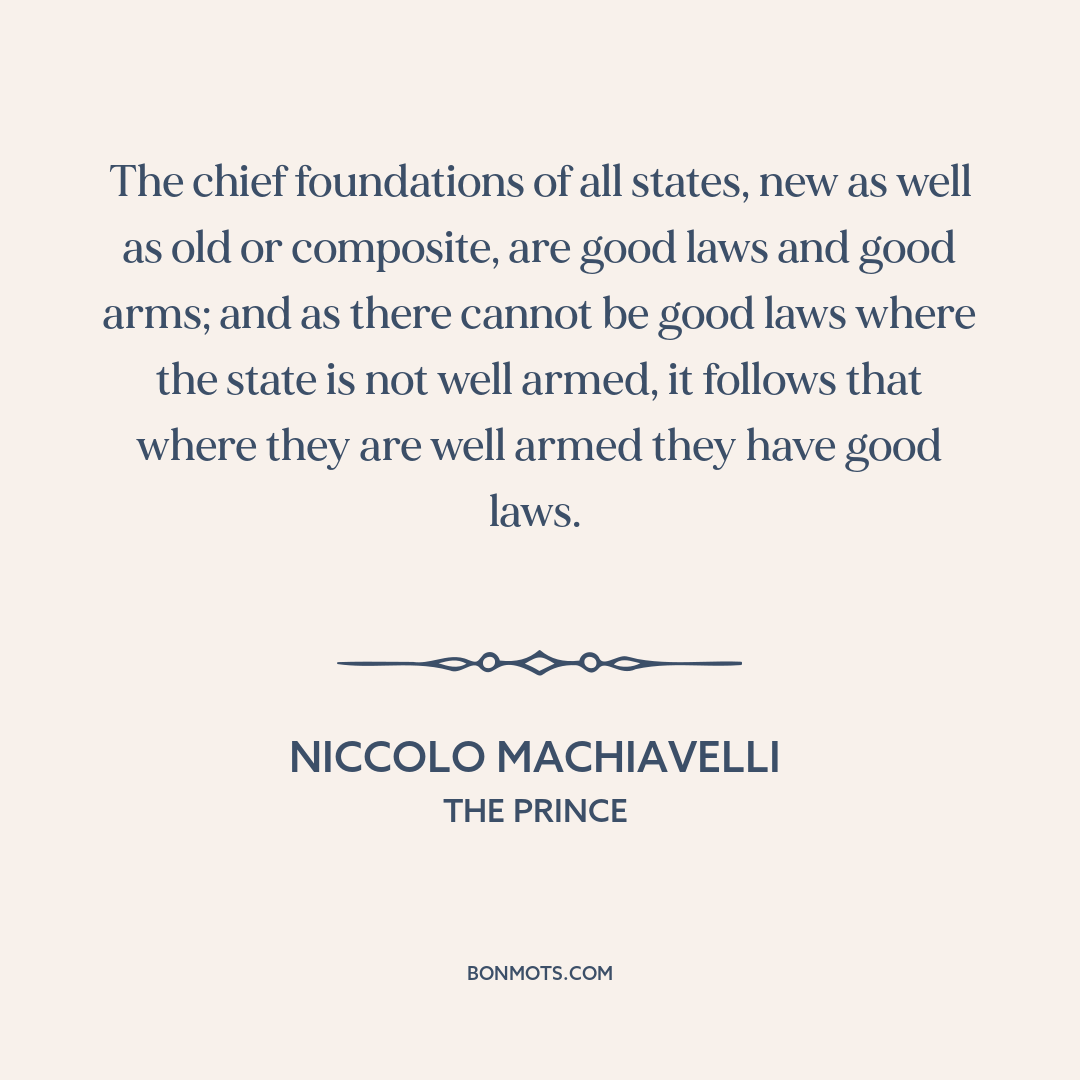 The chief foundations of all states, new as well as old or composite, are good laws and good arms; and as there cannot be good laws where the state is not well armed, it follows that where they are well armed they have good laws.