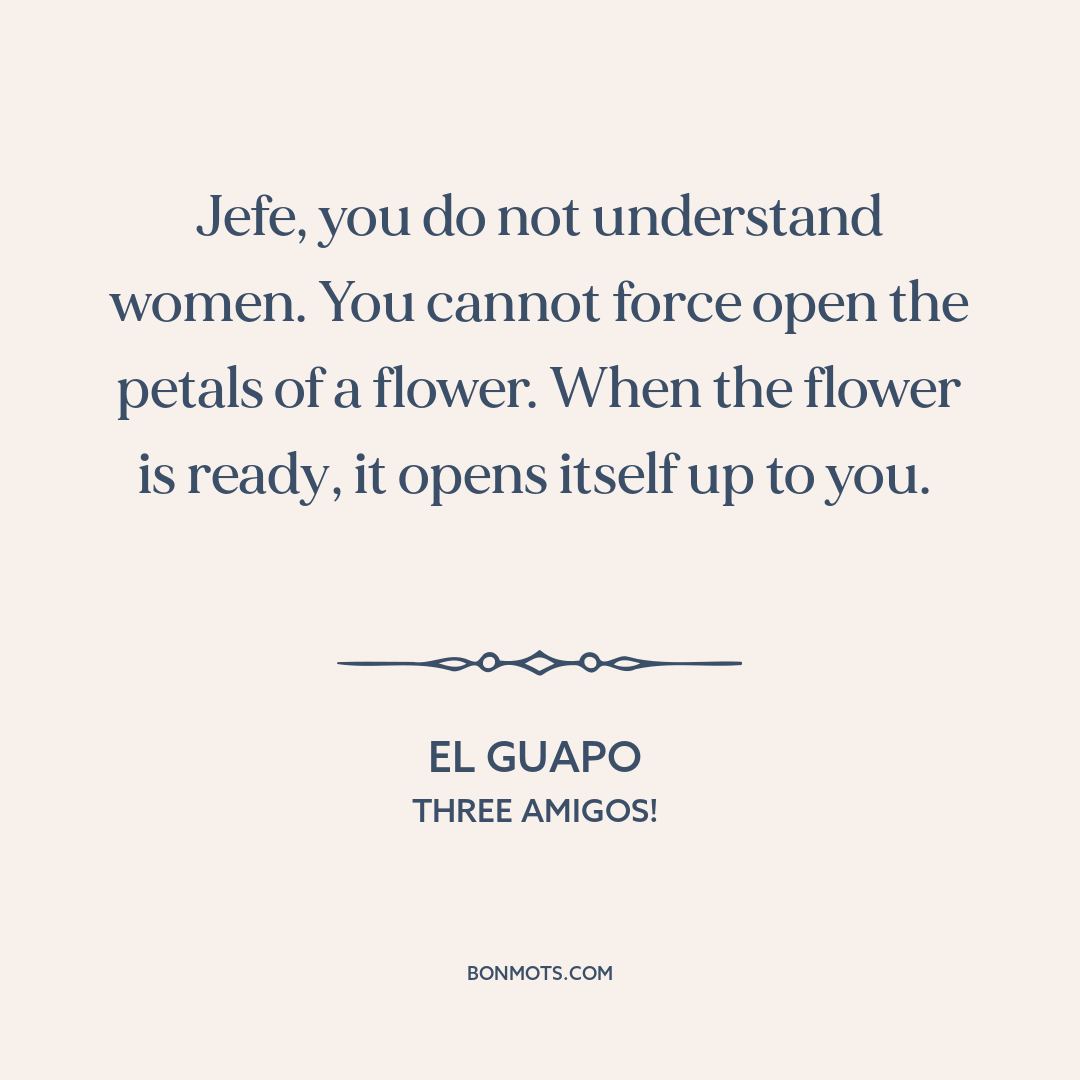 Jefe, you do not understand women. You cannot force open the petals of a flower. When the flower is ready, it opens itself up to you.