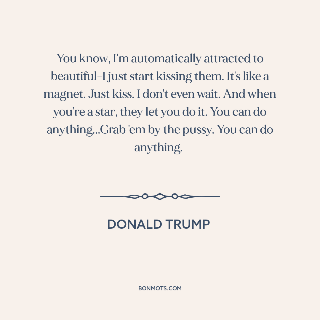 You know, I'm automatically attracted to beautiful-I just start kissing them. It's like a magnet. Just kiss. I don't even wait. And when you're a star, they let you do it. You can do anything...Grab 'em by the pussy. You can do anything.