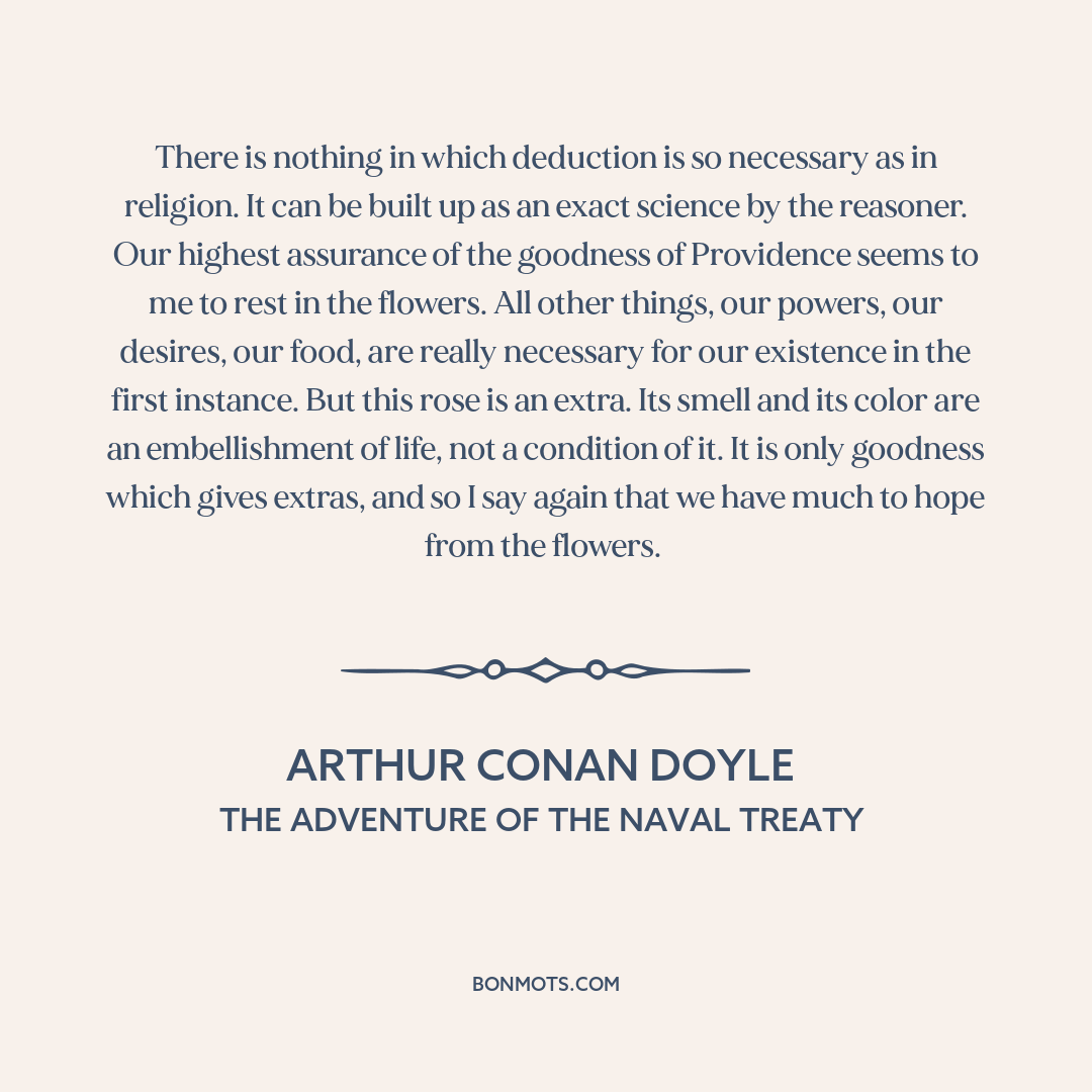 There is nothing in which deduction is so necessary as in religion. It can be built up as an exact science by the reasoner. Our highest assurance of the goodness of Providence seems to me to rest in the flowers. All other things, our powers, our desires, our food, are really necessary for our existence in the first instance. But this rose is an extra. Its smell and its color are an embellishment of life, not a condition of it. It is only goodness which gives extras, and so I say again that we have much to hope from the flowers.
