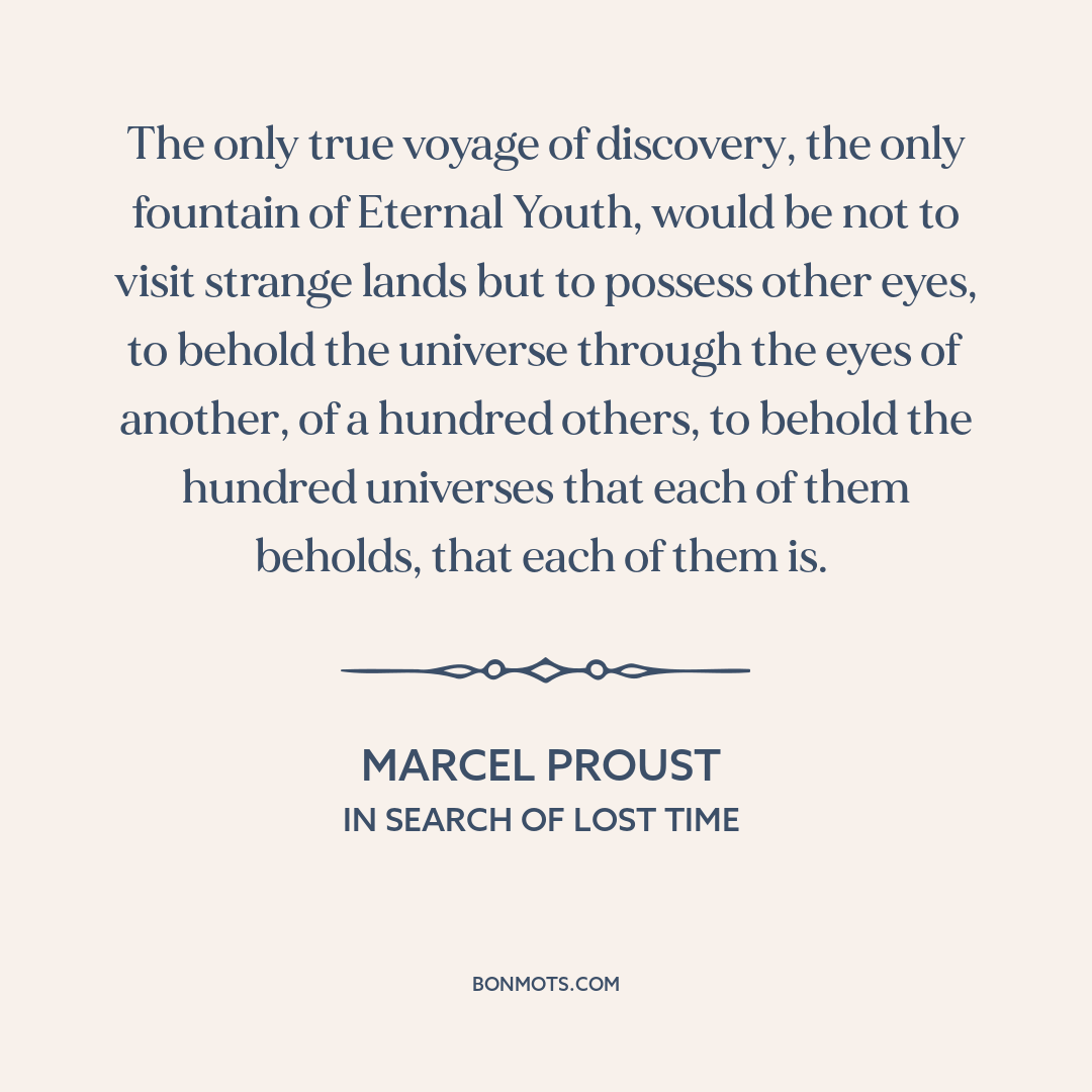 The only true voyage of discovery, the only fountain of Eternal Youth, would be not to visit strange lands but to possess other eyes, to behold the universe through the eyes of another, of a hundred others, to behold the hundred universes that each of them beholds, that each of them is.