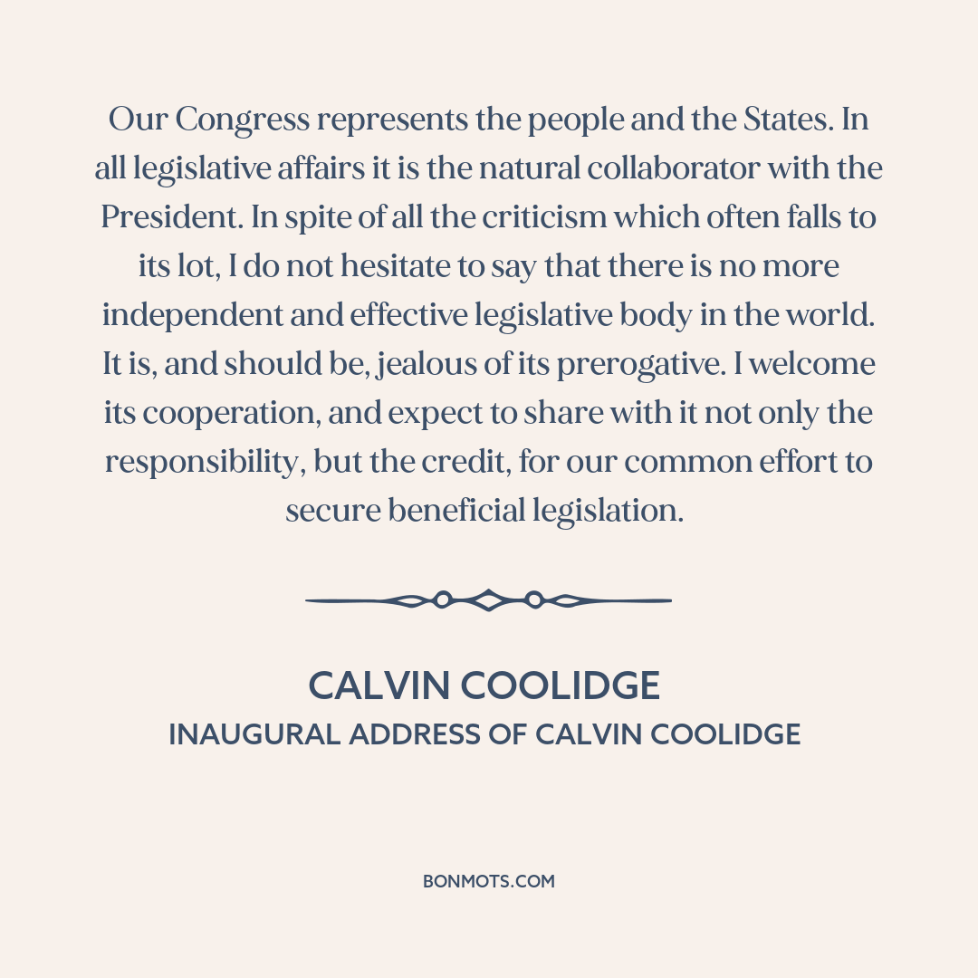 Our Congress represents the people and the States. In all legislative affairs it is the natural collaborator with the President. In spite of all the criticism which often falls to its lot, I do not hesitate to say that there is no more independent and effective legislative body in the world. It is, and should be, jealous of its prerogative. I welcome its cooperation, and expect to share with it not only the responsibility, but the credit, for our common effort to secure beneficial legislation.