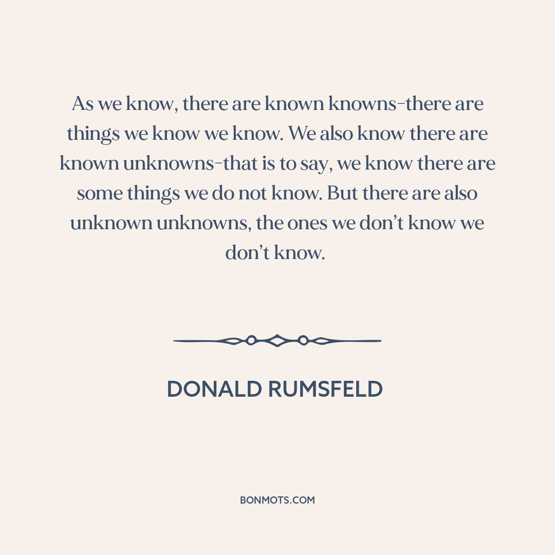 As we know, there are known knowns-there are things we know we know. We also know there are known unknowns-that is to say, we know there are some things we do not know. But there are also unknown unknowns, the ones we don’t know we don’t know.