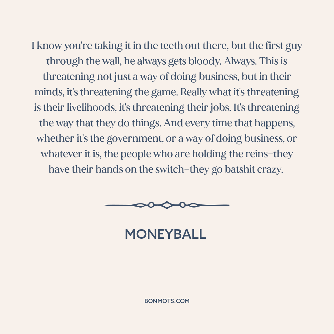 I know you're taking it in the teeth out there, but the first guy through the wall, he always gets bloody. Always. This is threatening not just a way of doing business, but in their minds, it's threatening the game. Really what it's threatening is their livelihoods, it's threatening their jobs. It's threatening the way that they do things. And every time that happens, whether it's the government, or a way of doing business, or whatever it is, the people who are holding the reins—they have their hands on the switch—they go batshit crazy.