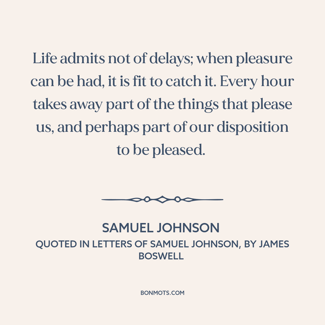 Life admits not of delays; when pleasure can be had, it is fit to catch it. Every hour takes away part of the things that please us, and perhaps part of our disposition to be pleased.