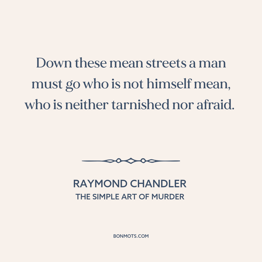 Down these mean streets a man must go who is not himself mean, who is neither tarnished nor afraid.