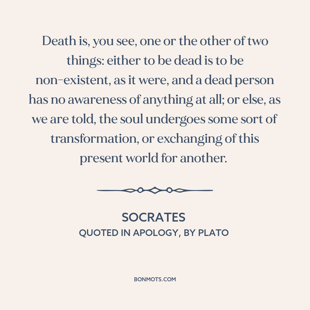 Death is, you see, one or the other of two things: either to be dead is to be non-existent, as it were, and a dead person has no awareness of anything at all; or else, as we are told, the soul undergoes some sort of transformation, or exchanging of this present world for another.