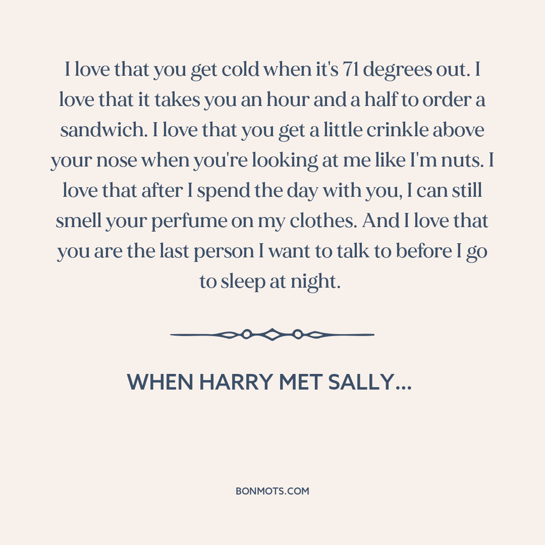 I love that you get cold when it's 71 degrees out. I love that it takes you an hour and a half to order a sandwich. I love that you get a little crinkle above your nose when you're looking at me like I'm nuts. I love that after I spend the day with you, I can still smell your perfume on my clothes. And I love that you are the last person I want to talk to before I go to sleep at night.