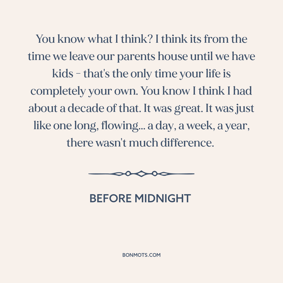You know what I think? I think its from the time we leave our parents house until we have kids - that's the only time your life is completely your own. You know I think I had about a decade of that. It was great. It was just like one long, flowing... a day, a week, a year, there wasn't much difference.