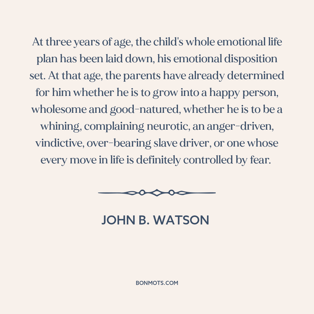 At three years of age, the child's whole emotional life plan has been laid down, his emotional disposition set. At that age, the parents have already determined for him whether he is to grow into a happy person, wholesome and good-natured, whether he is to be a whining, complaining neurotic, an anger-driven, vindictive, over-bearing slave driver, or one whose every move in life is definitely controlled by fear.