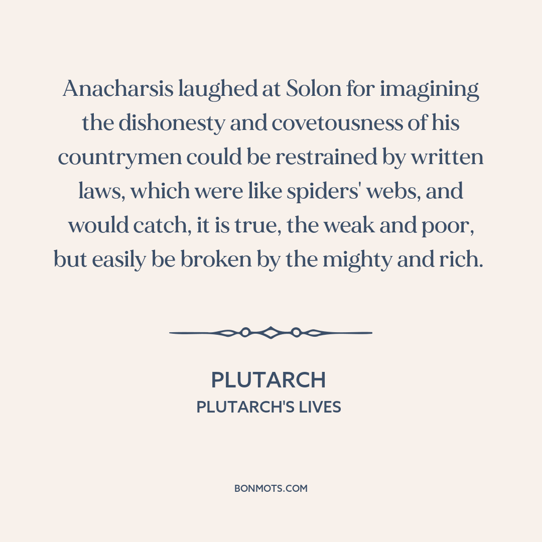 Anacharsis laughed at Solon for imagining the dishonesty and covetousness of his countrymen could be restrained by written laws, which were like spiders' webs, and would catch, it is true, the weak and poor, but easily be broken by the mighty and rich.