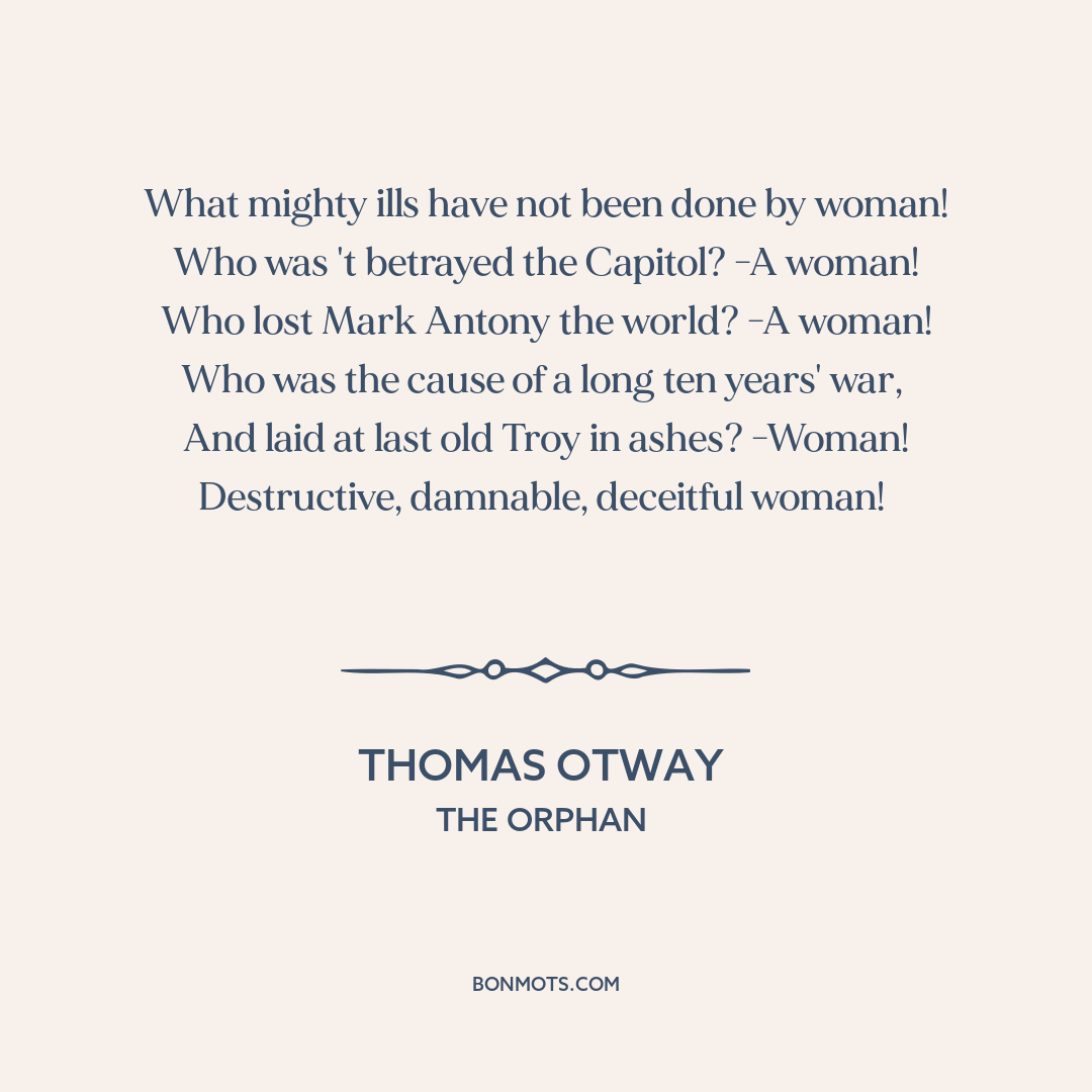 Otway, Thomas. The Orphan. Performed by Elizabeth Barry and Thomas Betterton and Thomas Gillow and John Wiltshire and Henry Norris and William Smith and Thomas Percival and Margaret Osborne and Joseph Williams. 1680, Dorset Garden Theatre, London, England, UK, act 3, sc. 1.