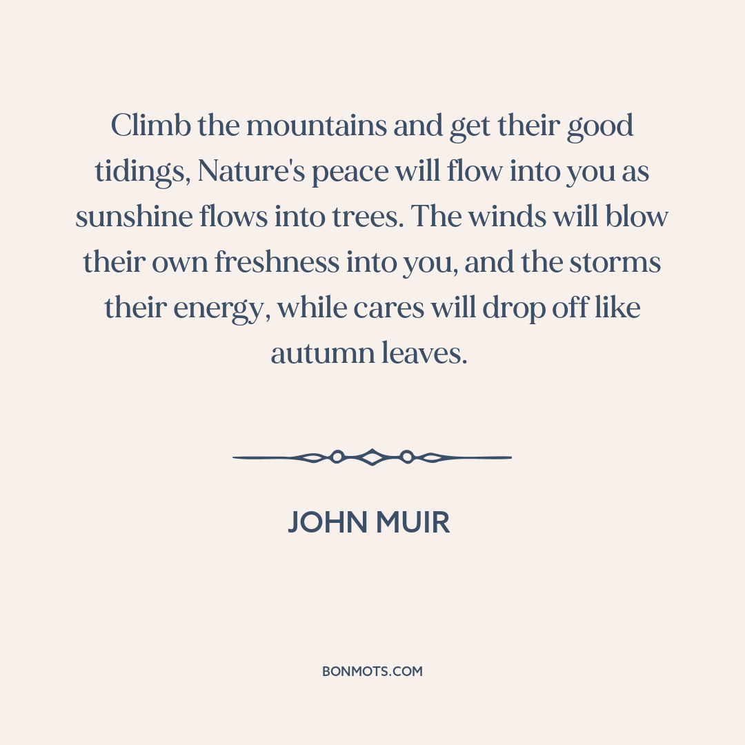 Climb the mountains and get their good tidings, Nature's peace will flow into you as sunshine flows into trees. The winds will blow their own freshness into you, and the storms their energy, while cares will drop off like autumn leaves.