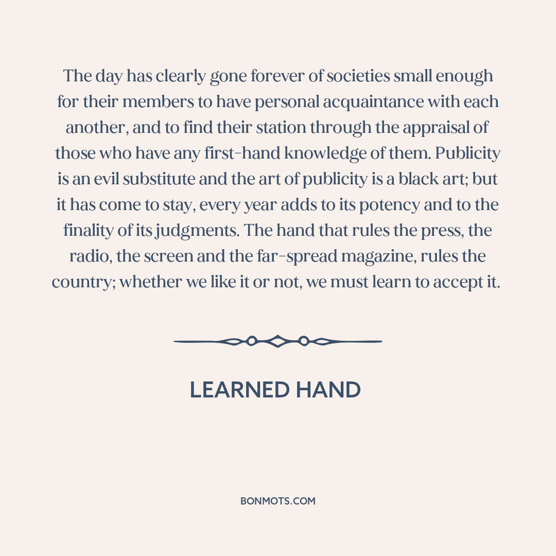 The day has clearly gone forever of societies small enough for their members to have personal acquaintance with each another, and to find their station through the appraisal of those who have any first-hand knowledge of them. Publicity is an evil substitute and the art of publicity is a black art; but it has come to stay, every year adds to its potency and to the finality of its judgments. The hand that rules the press, the radio, the screen and the far-spread magazine, rules the country; whether we like it or not, we must learn to accept it.