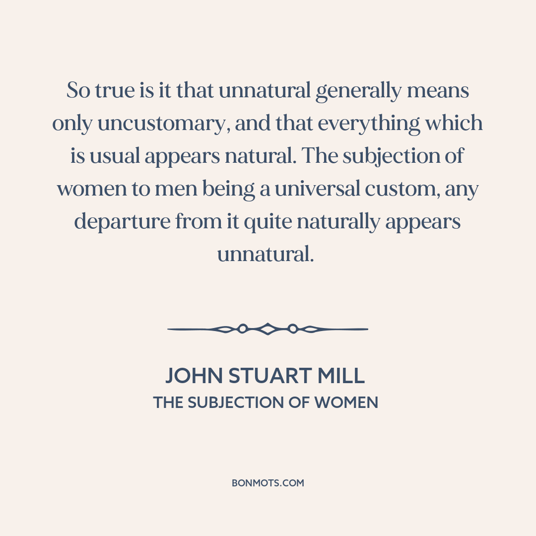 So true is it that unnatural generally means only uncustomary, and that everything which is usual appears natural. The subjection of women to men being a universal custom, any departure from it quite naturally appears unnatural.