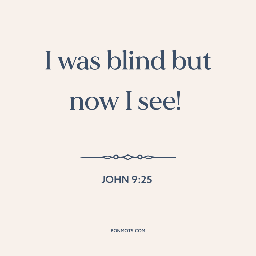 I was blind but now I see! τυφλὸς ὢν ἄρτι βλέπω. John 9:25 Buy the Bible (NIV) at Amazon Buy the Bible (NIV) at Amazon Read this verse at Bible Hub Instagram sharing coming soon. Quote text and source copied to clipboard. Link to this quote copied to clipboard. More information about this quote Topic Miracles Source Gospel of John The Bible Medium Scripture Genre Religious literature Language Greek Time 90 90s 1st century Era Classical antiquity Authentication Score 3 More information on Authentication Score coming soon. Citation The Holy Bible, New International Version. International Bible Society, 1978. (John 9:25). Citation text copied to clipboard.