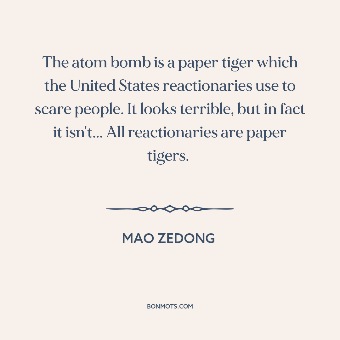 The atom bomb is a paper tiger which the United States reactionaries use to scare people. It looks terrible, but in fact it isn't... All reactionaries are paper tigers.