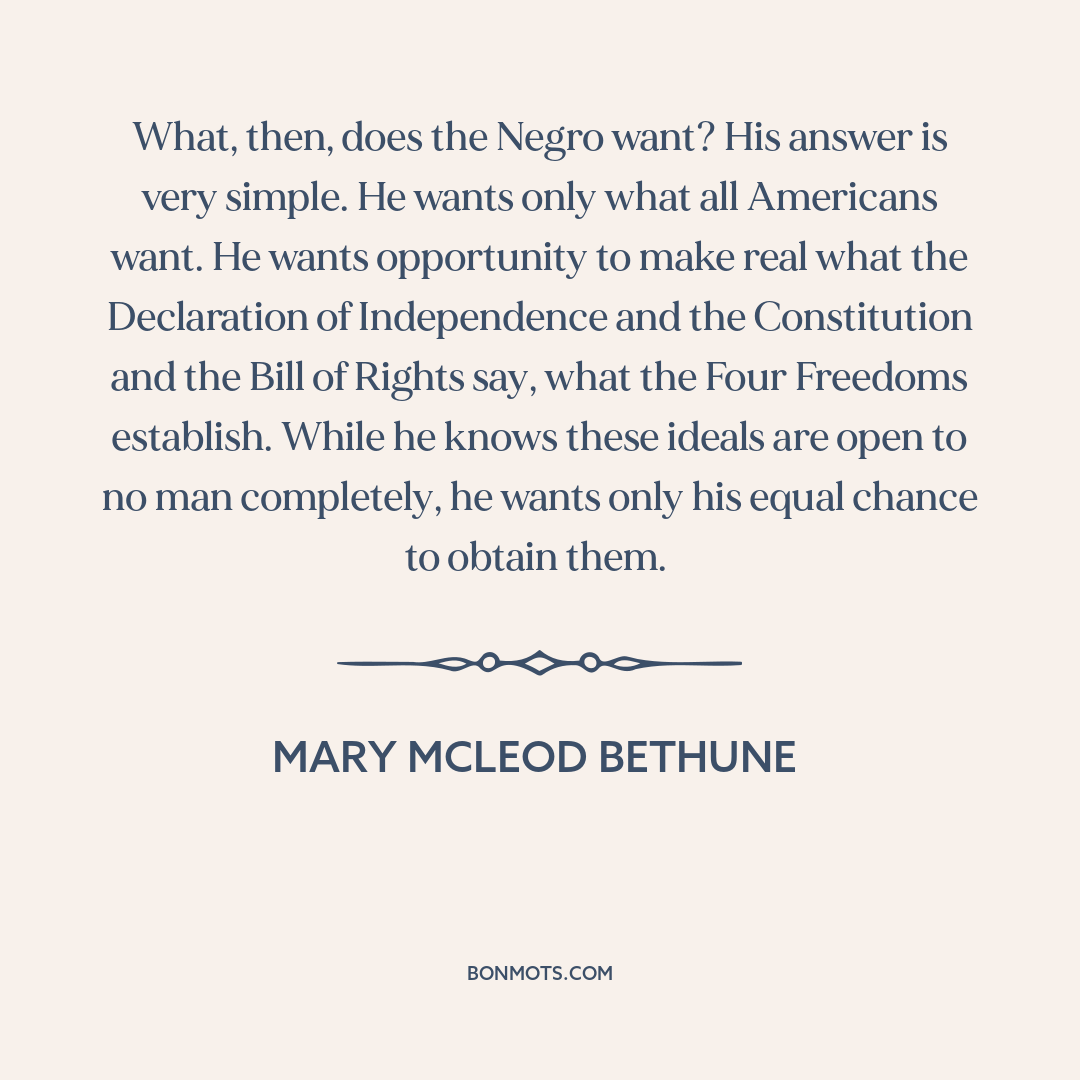 What, then, does the Negro want? His answer is very simple. He wants only what all Americans want. He wants opportunity to make real what the Declaration of Independence and the Constitution and the Bill of Rights say, what the Four Freedoms establish. While he knows these ideals are open to no man completely, he wants only his equal chance to obtain them.