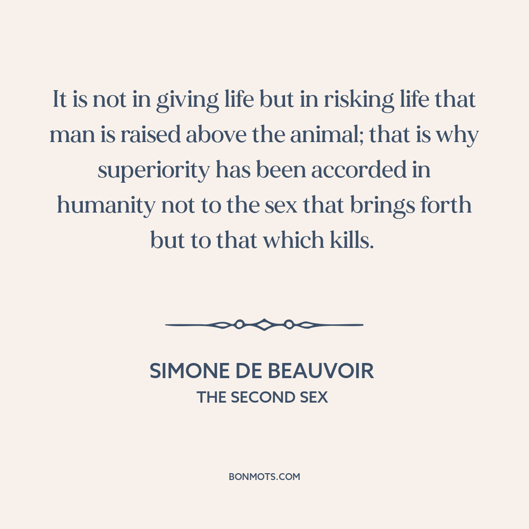 It is not in giving life but in risking life that man is raised above the animal; that is why superiority has been accorded in humanity not to the sex that brings forth but to that which kills.