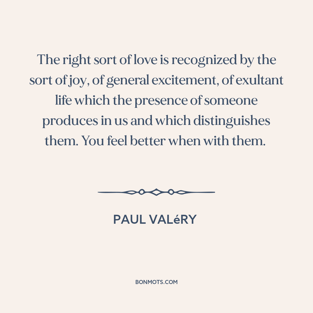 The right sort of love is recognized by the sort of joy, of general excitement, of exultant life which the presence of someone produces in us and which distinguishes them. You feel better when with them.