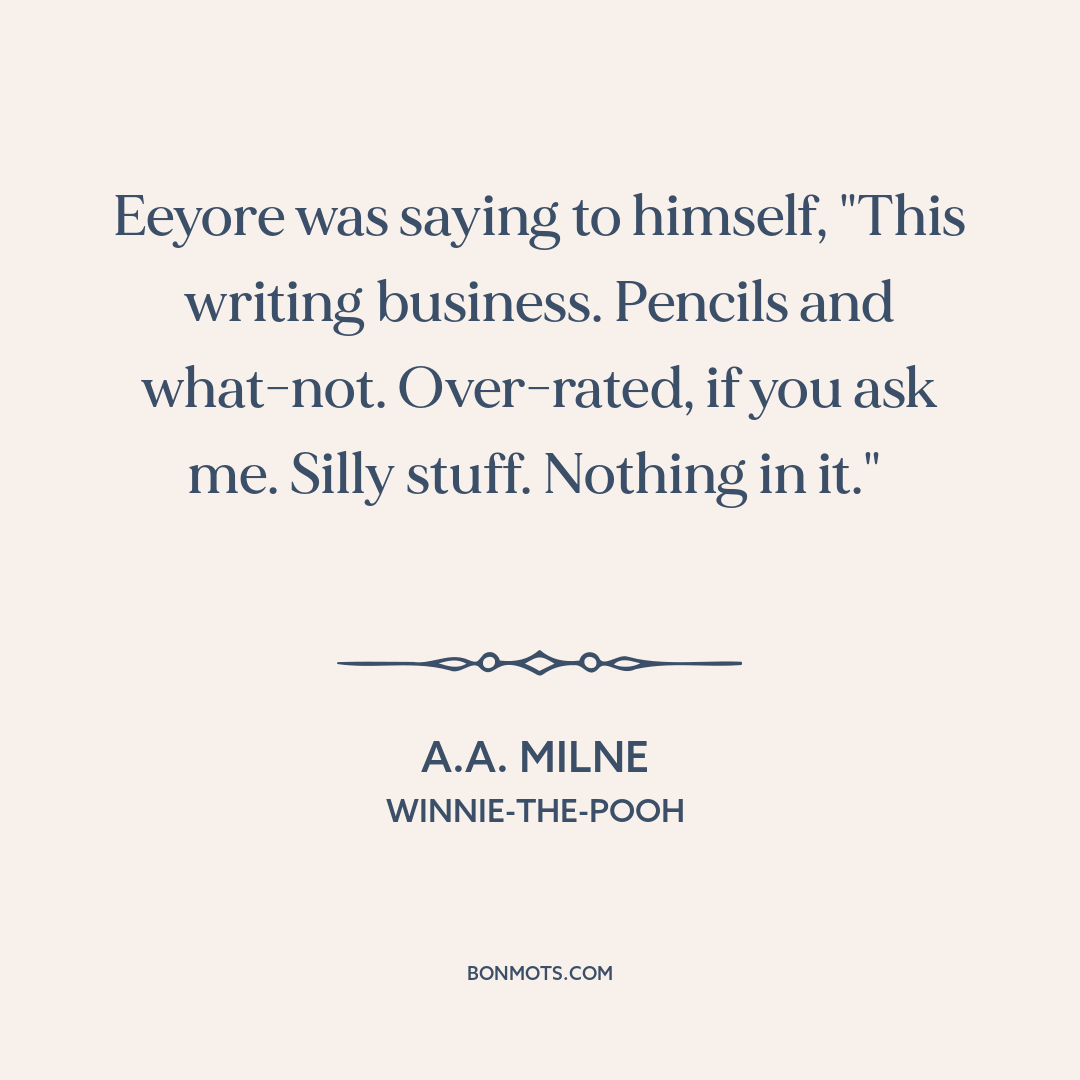 Eeyore was saying to himself, "This writing business. Pencils and what-not. Over-rated, if you ask me. Silly stuff. Nothing in it."
