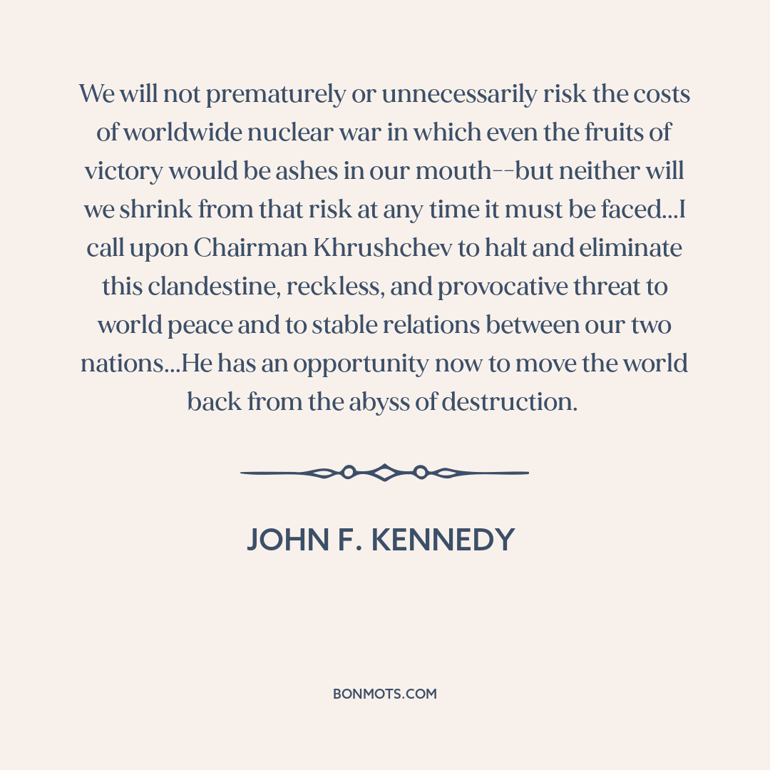 We will not prematurely or unnecessarily risk the costs of worldwide nuclear war in which even the fruits of victory would be ashes in our mouth--but neither will we shrink from that risk at any time it must be faced...I call upon Chairman Khrushchev to halt and eliminate this clandestine, reckless, and provocative threat to world peace and to stable relations between our two nations...He has an opportunity now to move the world back from the abyss of destruction.