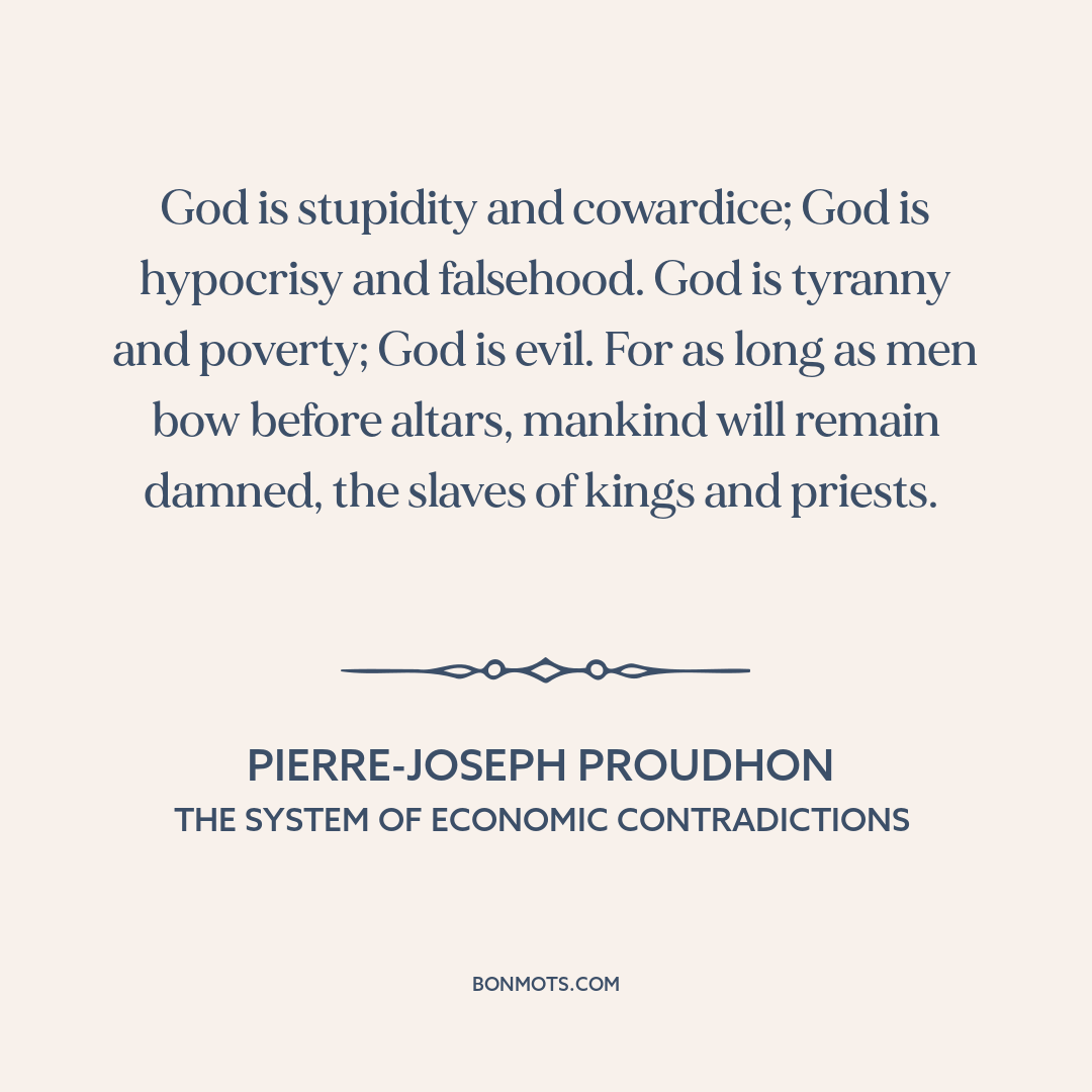 God is stupidity and cowardice; God is hypocrisy and falsehood. God is tyranny and poverty; God is evil. For as long as men bow before altars, mankind will remain damned, the slaves of kings and priests.