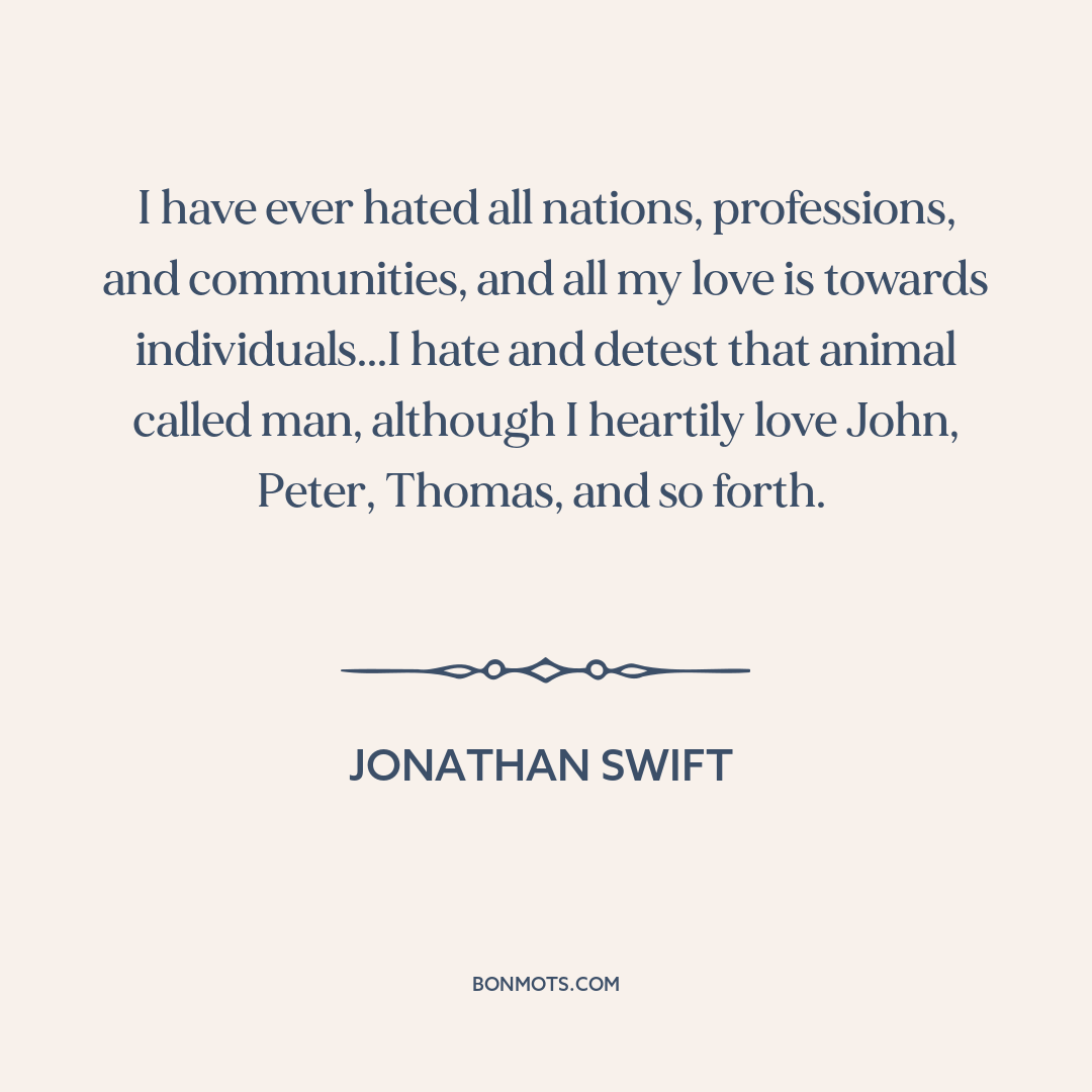 I have ever hated all nations, professions, and communities, and all my love is towards individuals...I hate and detest that animal called man, although I heartily love John, Peter, Thomas, and so forth.