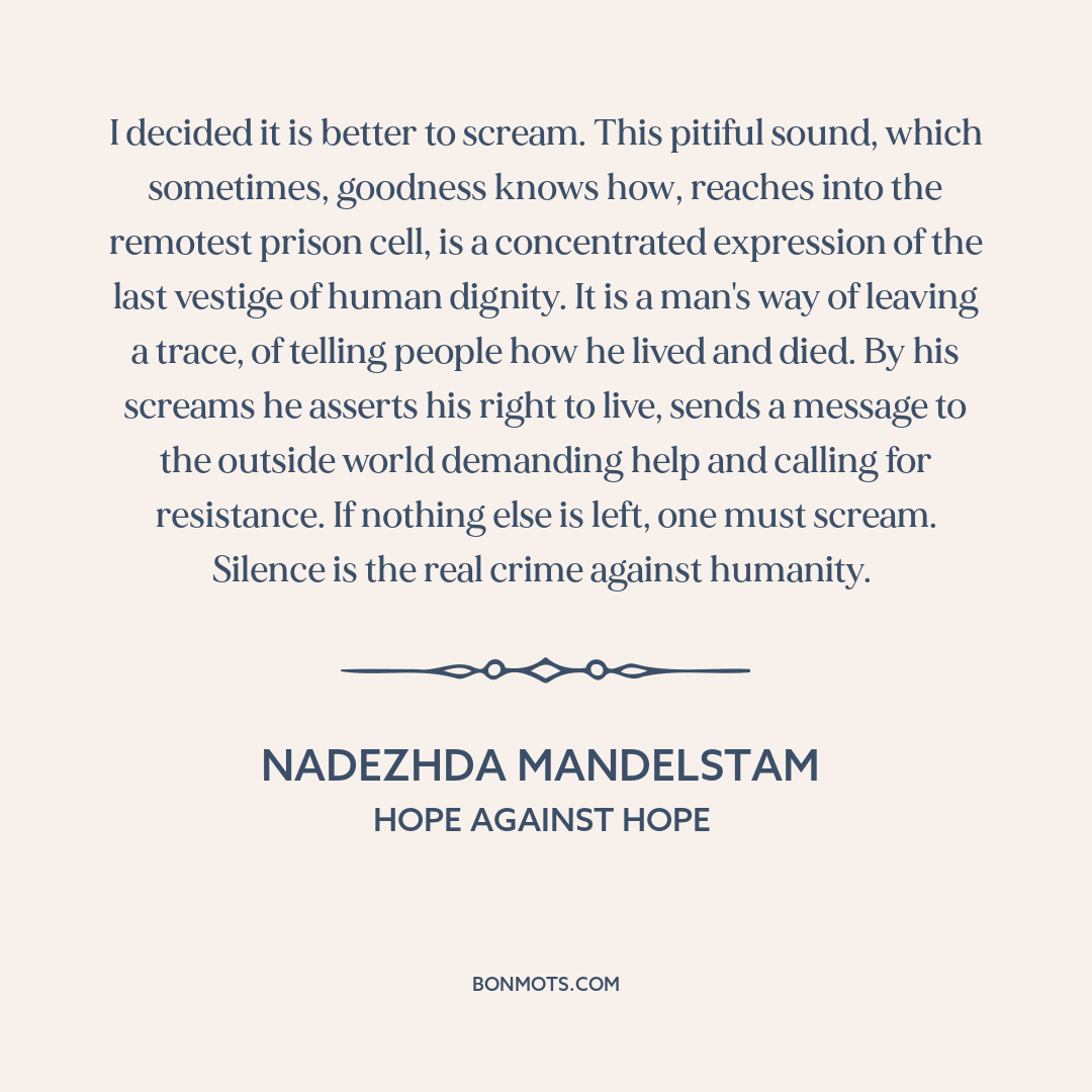 I decided it is better to scream. This pitiful sound, which sometimes, goodness knows how, reaches into the remotest prison cell, is a concentrated expression of the last vestige of human dignity. It is a man's way of leaving a trace, of telling people how he lived and died. By his screams he asserts his right to live, sends a message to the outside world demanding help and calling for resistance. If nothing else is left, one must scream. Silence is the real crime against humanity.