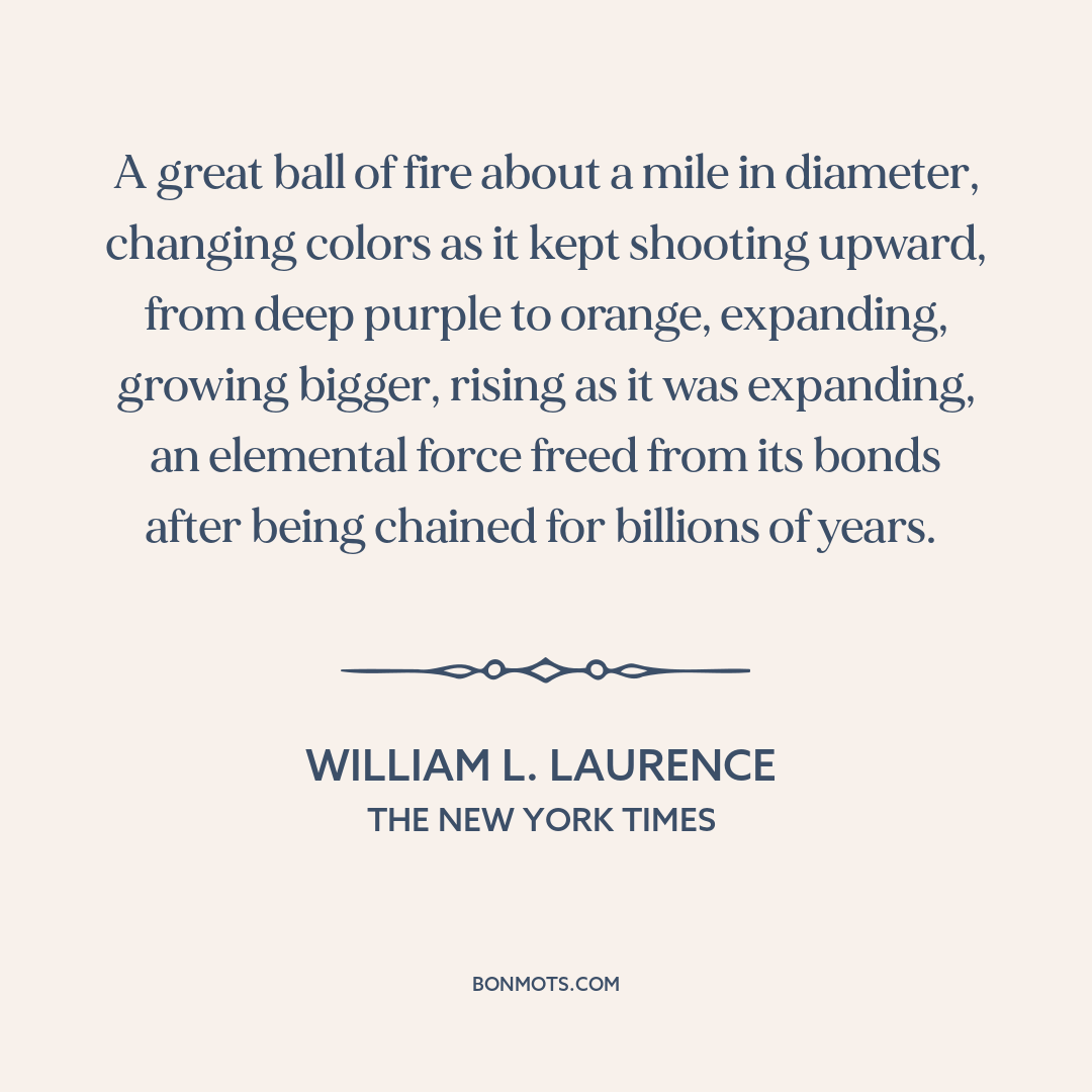 A great ball of fire about a mile in diameter, changing colors as it kept shooting upward, from deep purple to orange, expanding, growing bigger, rising as it was expanding, an elemental force freed from its bonds after being chained for billions of years.