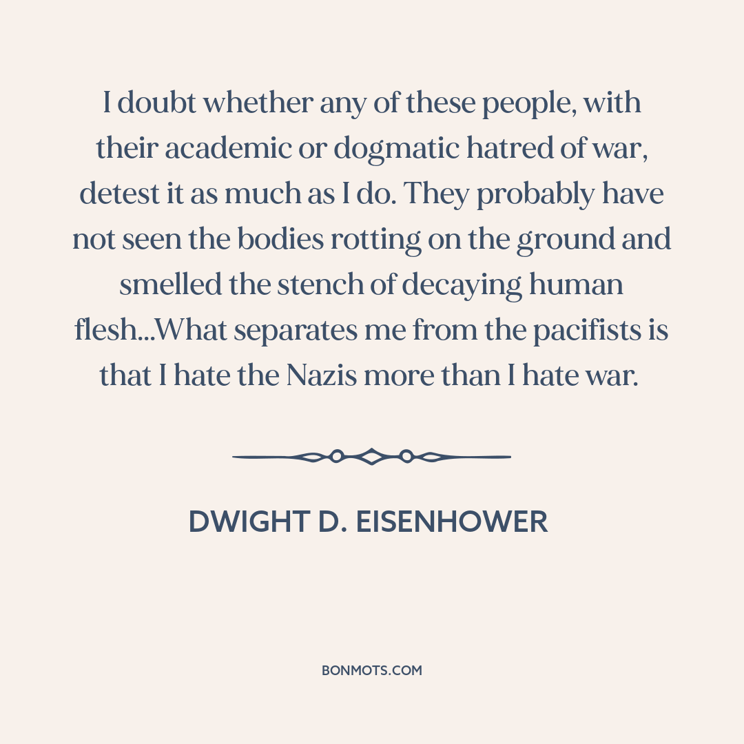 I doubt whether any of these people, with their academic or dogmatic hatred of war, detest it as much as I do. They probably have not seen the bodies rotting on the ground and smelled the stench of decaying human flesh...What separates me from the pacifists is that I hate the Nazis more than I hate war.