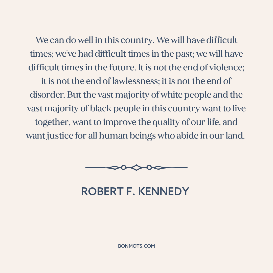 We can do well in this country. We will have difficult times; we've had difficult times in the past; we will have difficult times in the future. It is not the end of violence; it is not the end of lawlessness; it is not the end of disorder. But the vast majority of white people and the vast majority of black people in this country want to live together, want to improve the quality of our life, and want justice for all human beings who abide in our land.
