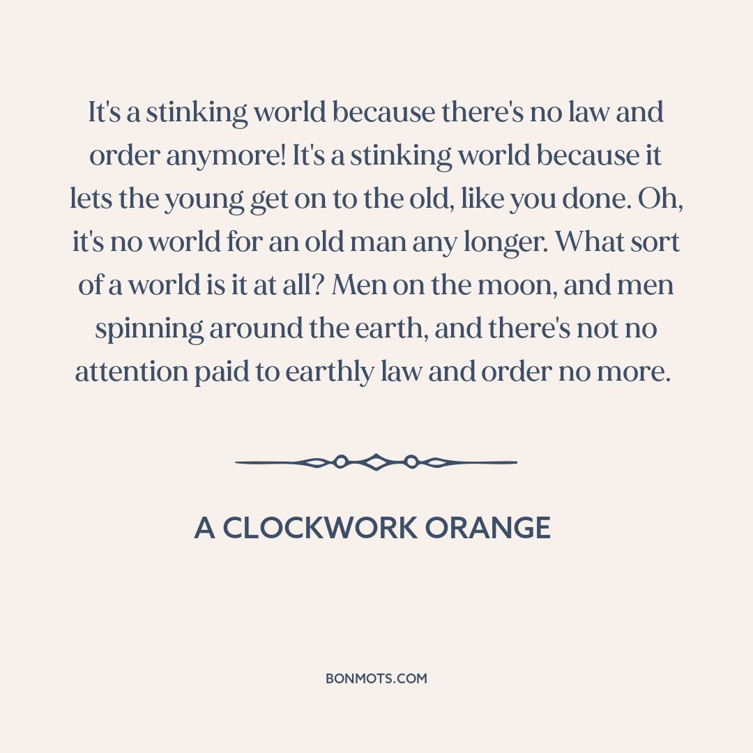 It's a stinking world because there's no law and order anymore! It's a stinking world because it lets the young get on to the old, like you done. Oh, it's no world for an old man any longer. What sort of a world is it at all? Men on the moon, and men spinning around the earth, and there's not no attention paid to earthly law and order no more.