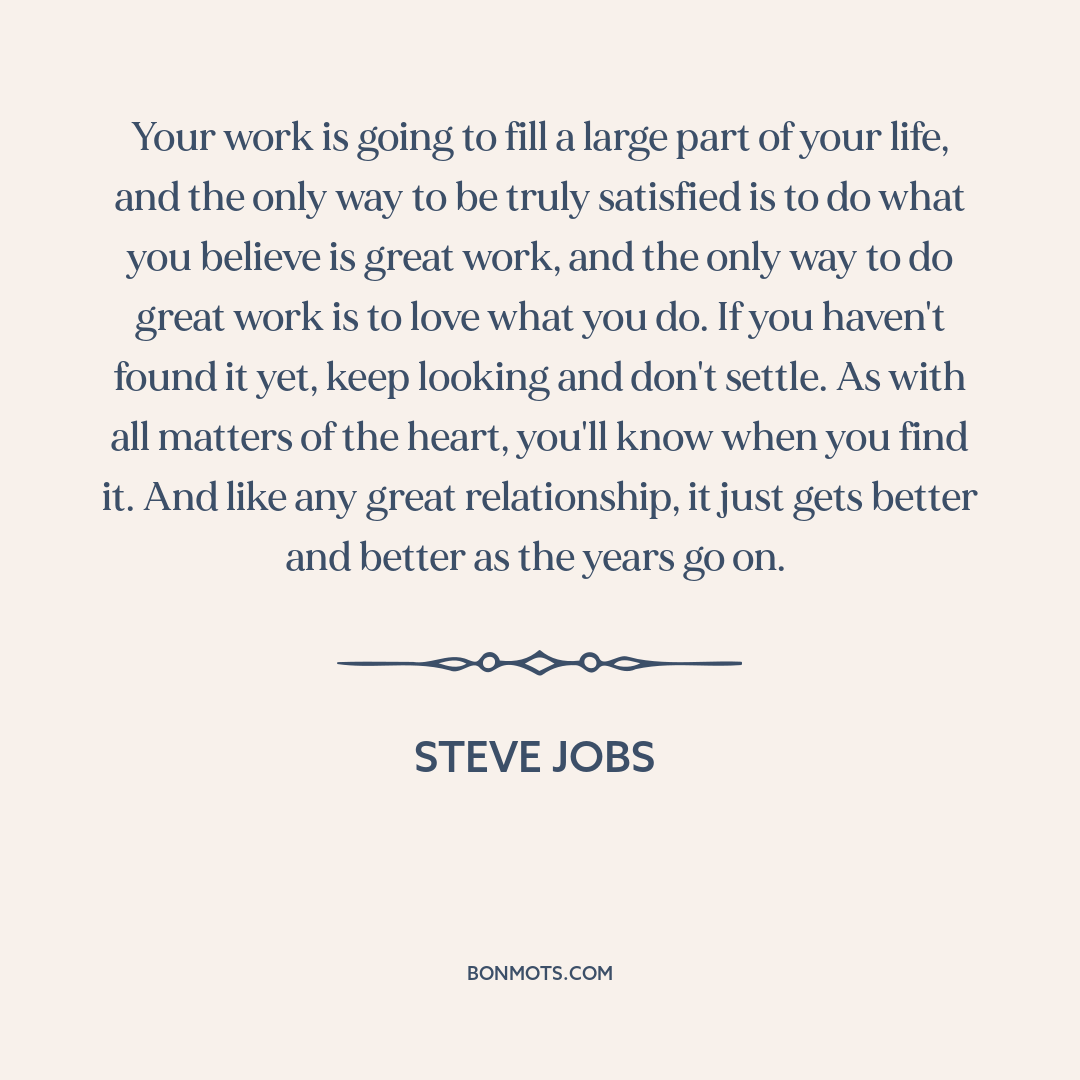 Your work is going to fill a large part of your life, and the only way to be truly satisfied is to do what you believe is great work, and the only way to do great work is to love what you do. If you haven't found it yet, keep looking and don't settle. As with all matters of the heart, you'll know when you find it. And like any great relationship, it just gets better and better as the years go on.