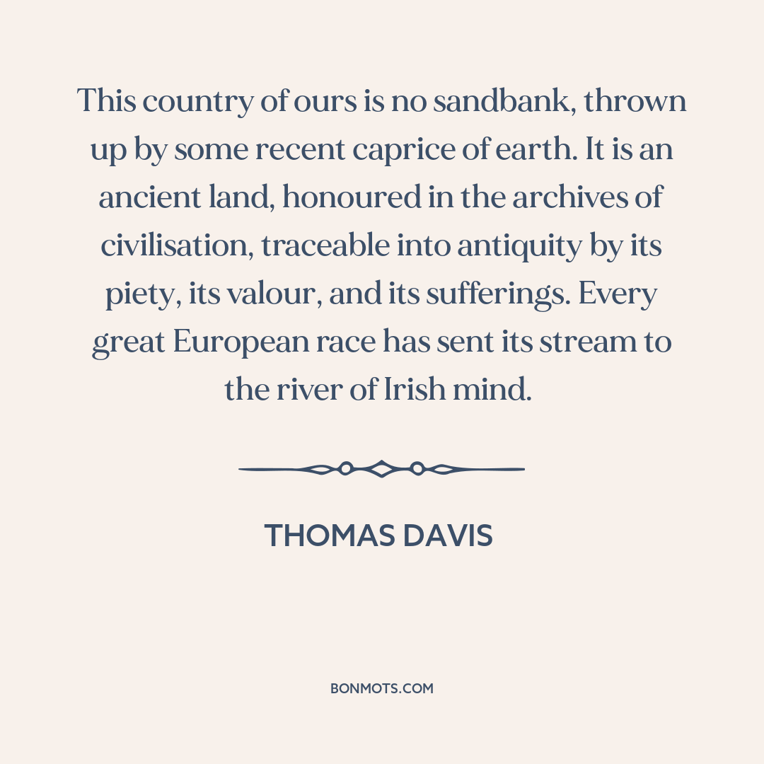 This country of ours is no sandbank, thrown up by some recent caprice of earth. It is an ancient land, honoured in the archives of civilisation, traceable into antiquity by its piety, its valour, and its sufferings. Every great European race has sent its stream to the river of Irish mind.