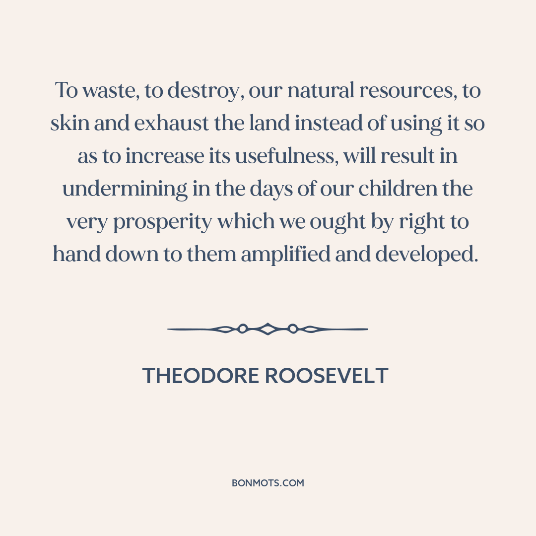 To waste, to destroy, our natural resources, to skin and exhaust the land instead of using it so as to increase its usefulness, will result in undermining in the days of our children the very prosperity which we ought by right to hand down to them amplified and developed.