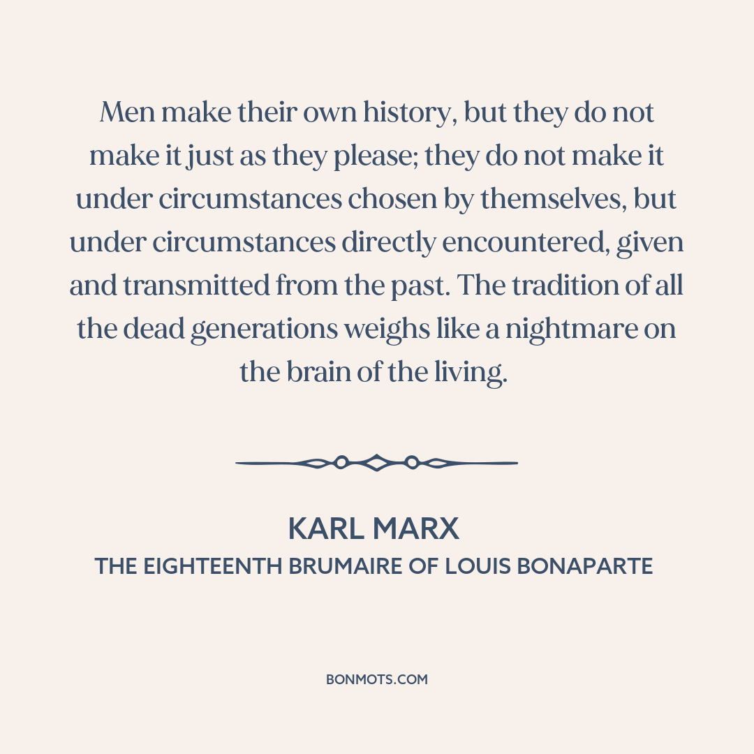 Men make their own history, but they do not make it just as they please; they do not make it under circumstances chosen by themselves, but under circumstances directly encountered, given and transmitted from the past. The tradition of all the dead generations weighs like a nightmare on the brain of the living.