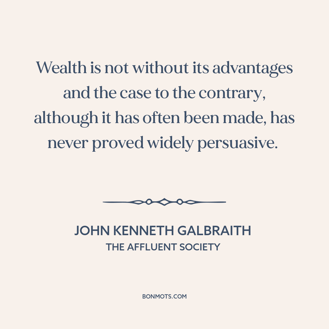 Wealth is not without its advantages and the case to the contrary, although it has often been made, has never proved widely persuasive.
