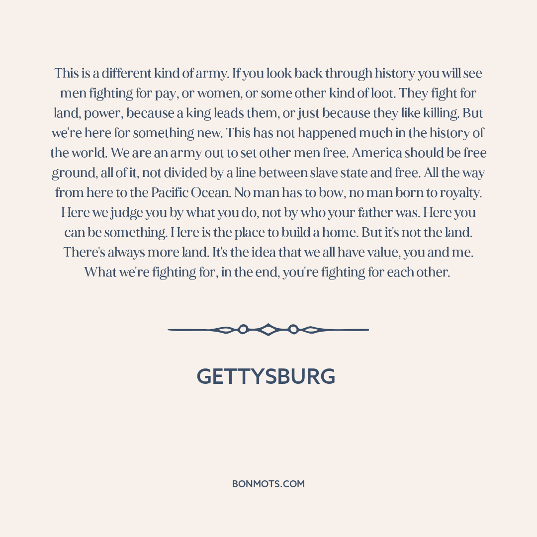 This is a different kind of army. If you look back through history you will see men fighting for pay, or women, or some other kind of loot. They fight for land, power, because a king leads them, or just because they like killing. But we're here for something new. This has not happened much in the history of the world. We are an army out to set other men free. America should be free ground, all of it, not divided by a line between slave state and free. All the way from here to the Pacific Ocean. No man has to bow, no man born to royalty. Here we judge you by what you do, not by who your father was. Here you can be something. Here is the place to build a home. But it's not the land. There's always more land. It's the idea that we all have value, you and me. What we're fighting for, in the end, you're fighting for each other.