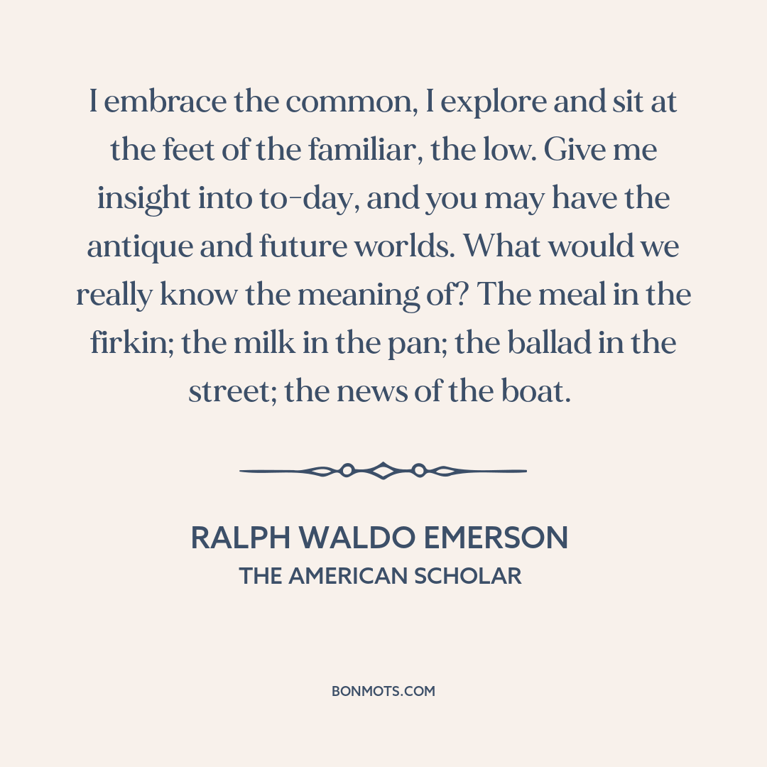 I embrace the common, I explore and sit at the feet of the familiar, the low. Give me insight into to-day, and you may have the antique and future worlds. What would we really know the meaning of? The meal in the firkin; the milk in the pan; the ballad in the street; the news of the boat.