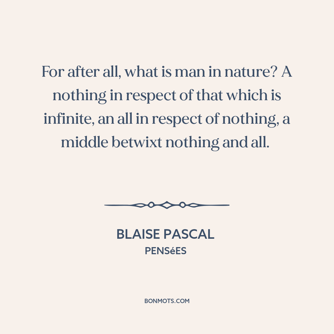 For after all, what is man in nature? A nothing in respect of that which is infinite, an all in respect of nothing, a middle betwixt nothing and all.