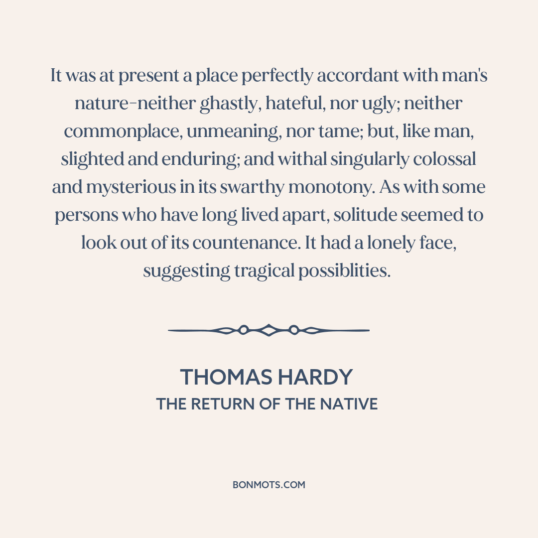 It was at present a place perfectly accordant with man's nature-neither ghastly, hateful, nor ugly; neither commonplace, unmeaning, nor tame; but, like man, slighted and enduring; and withal singularly colossal and mysterious in its swarthy monotony. As with some persons who have long lived apart, solitude seemed to look out of its countenance. It had a lonely face, suggesting tragical possiblities.