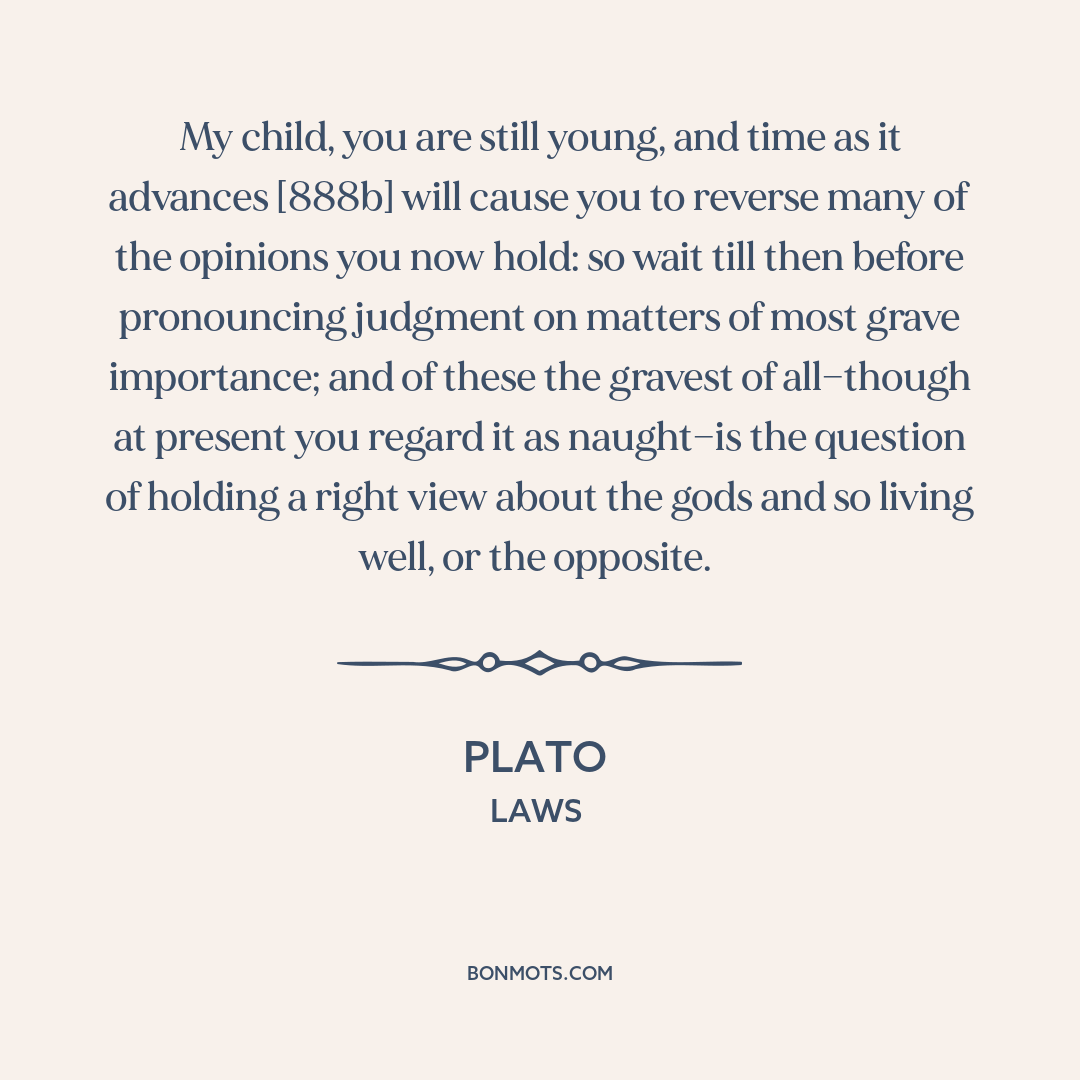My child, you are still young, and time as it advances [888b] will cause you to reverse many of the opinions you now hold: so wait till then before pronouncing judgment on matters of most grave importance; and of these the gravest of all—though at present you regard it as naught—is the question of holding a right view about the gods and so living well, or the opposite.