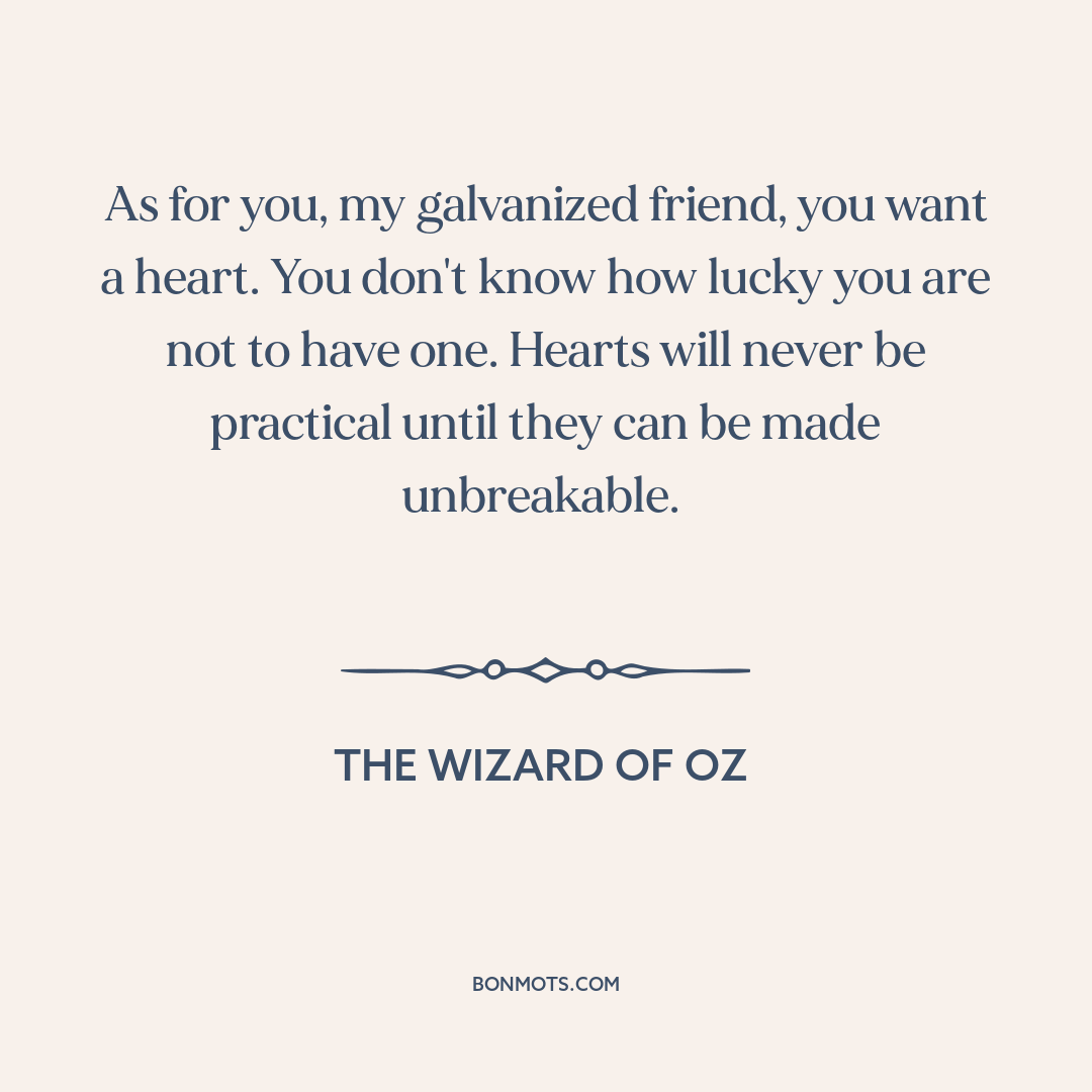 As for you, my galvanized friend, you want a heart. You don't know how lucky you are not to have one. Hearts will never be practical until they can be made unbreakable.