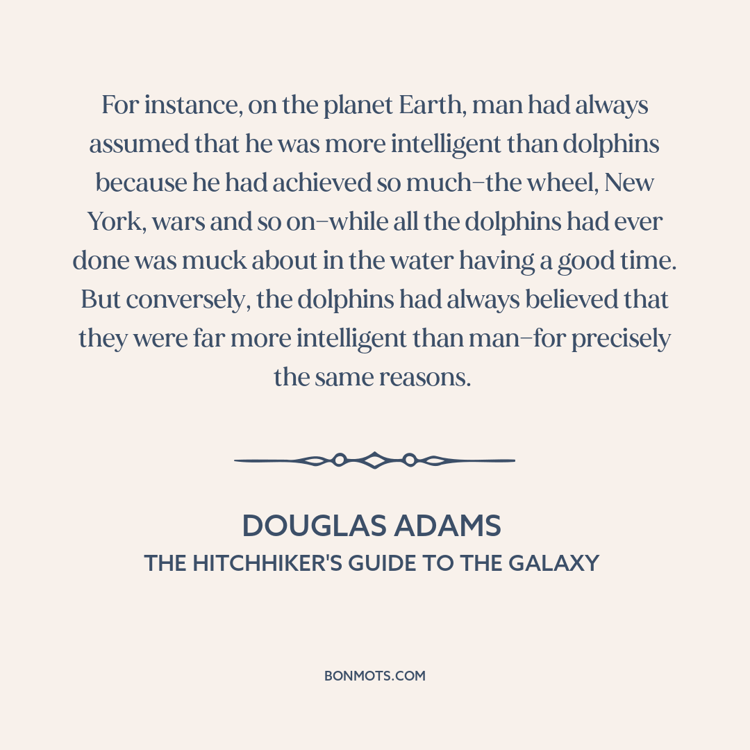 For instance, on the planet Earth, man had always assumed that he was more intelligent than dolphins because he had achieved so much—the wheel, New York, wars and so on—while all the dolphins had ever done was muck about in the water having a good time. But conversely, the dolphins had always believed that they were far more intelligent than man—for precisely the same reasons.